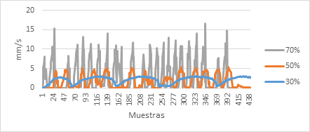 Efectuando repetidas veces el proceso de simulación, los datos se almacenan con el fin de compararlos con la respuesta de la experimentación. Para ello se utilizan tres concentraciones de polvo magnético (30%, 50% y 70%), obteniéndose sus respectivas curvas de magnetización (figura 5), con el fin de variar los parámetros de entrada en la simulación, donde se observa su comportamiento y su fiabilidad al modelo real. La variable de salida analizada es la velocidad, que está directamente ligada a la concentración magnética de cada elemento.