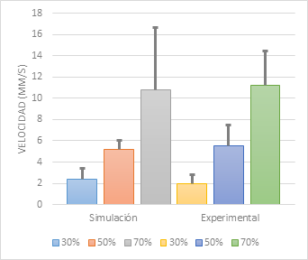 En la siguiente tabla se resumen los valores promedio de velocidad, obtenidos tanto en experimentación como en simulación. La desviación media obtenida en los resultados es de alrededor de 0.2 mm/s, un valor bastante bueno si se compara con modelos de simulación actuales en estos escenarios (Arcese et al., 2013).