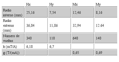 propia.Para la simulación del sistema se utilizó el arreglo de bobinas Helmholtz y Maxwell presente en el laboratorio (figura 2), con las características resumidas en la Tabla 1. En ella se encuentran las dimensiones para las bobinas tipo Helmholtz y tipo Maxwell en los ejes X e Y, número de vueltas y el cálculo de las constantes k y g de acuerdo a las ecuaciones (3) y (4).