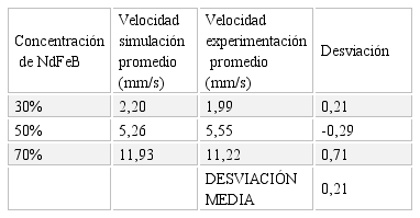 En la figura 6 se comparan los resultados promedio obtenidos en la simulación (izquierda), con los valores promedio registrados en la experimentación (derecha), para cada concentración de NdFeB. Los resultados en la simulación varían conforme la cantidad de concentración presente en el material, mostrando una clara correlación entre la velocidad y la concentración magnética, tal como en el sistema real. De igual manera, una mayor concentración obtendrá mejores respuestas en desplazamiento, pero una mayor dificultad de control de posición.