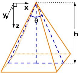 Esquema del punto cuántico piramidal de GaAs, la pirámide tiene una base cuadrada y está caracterizada por la altura (h) y el ángulo del vértice (θ).
