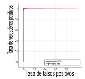 En cuanto a la curva ROC mostrada en Figura 2, es una gráfica que representa la Sensibilidad o Tasa de Verdaderos Positivos (TPR True Positive Rate) frente a la Tasa de Falsos Positivos (FPR False Positive Rate). Es usada para visualizar el desempeño de los clasificadores (Burgueño et al. 1995; Zhu et al. 2010; Cortés Osorio n.d.).
