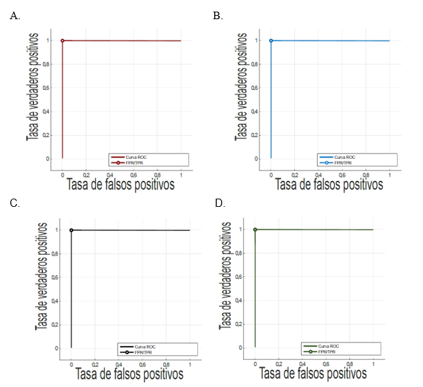 Curvas ROC de la bandola, tiple, tiple requinto, y guitarra arrojadas por la técnica de Red Neuronal Artificial con número de Neuronas igual a 10, aplicando PCA y eligiendo 100 Componentes Principales. A. Curva ROC de bandola. B. Curva ROC de guitarra. C. Curva ROC de tiple. D. Curva ROC de tiple requinto.