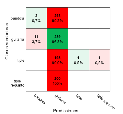En la Figura 11, se presenta la matriz de confusión dada por la técnica kNN con distancia Chebyshev y número de vecinos igual a 3, aplicando PCA y usando 1000 componentes principales, en ella se puede observar que los falsos negativos presentes en la bandola, tiple y tiple requinto fueron identificados como guitarra.