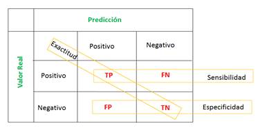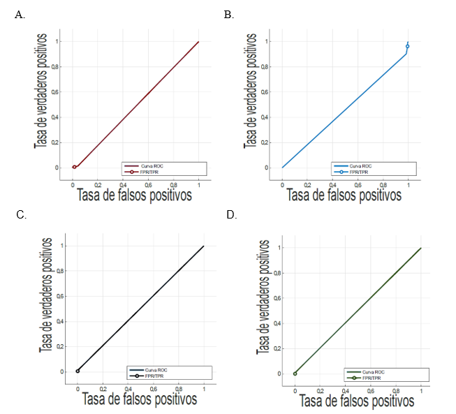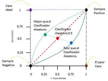 En la gráfica de la curva ROC expuesta en la Figura 2, la Sensibilidad es representada por el eje ‘Y’ y la Tasa de Falsos Positivos (FPR) por el eje ‘X’, sus coordenadas mínimas son (0,0) y las máximas son (1,1). Teniendo en cuenta lo anterior, se describen tres casos: El primero implica que si un clasificador posee una discriminación perfecta, con alta Sensibilidad y baja FPR, la curva de ROC pasa por la esquina superior izquierda. En el segundo caso si un clasificador tiene igual distribución, con igual Sensibilidad y FPR, la curva será una línea diagonal a 45° desde la esquina inferior izquierda hasta la esquina superior derecha y dicho clasificador tendrá un desempeño incierto. El caso tercero es cuando un clasificador tiene una alta FPR y baja Sensibilidad, en este, la curva cae por debajo de la línea diagonal de 45°, teniendo este clasificador un desempeño indeseado (Burgueño et al. 1995; Zhu et al. 2010; Cortés Osorio n.d.).