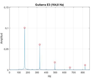 Identificación de los 5 primeros armónica de una señal de audio proveniente de la guitarra.