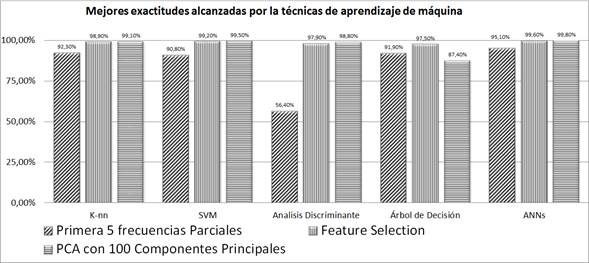 Tabla 6 Porcentaje de Exactitud alcanzadas por las técnicas de aprendizaje de Máquina utilizadas en la identificación de los instrumentos musicales.A continuación, en la gráfica de la Figura 7 se muestra las Exactitudes más altas de los cinco clasificadores, utilizando los métodos de reducción y selección de características. En ella se puede ver que la Exactitud menos favorable, entre las más altas, fue la alcanzada por Análisis Discriminante, aplicando como método reducción la extracción de las primeras cinco frecuencias parciales y sus amplitudes normalizadas con un porcentaje de 56,4%. También se puede evidenciar que la técnica de ANNs presenta los resultados de las Exactitudes más altas y al mismo tiempo son los más uniformes en los tres métodos de reducción de características propuestos.