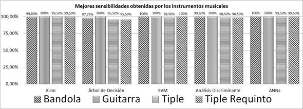 En la Figura 8, se muestra las Sensibilidades más altas presentadas por la bandola, la guitarra, el tiple y el tiple requinto en cada una de las técnicas de aprendizaje utilizadas en su identificación. En ella se puede ver en forma global que las Sensibilidades alcanzadas fueron superiores al 95%, además también se puede apreciar que la Sensibilidad más alta es la obtenida por la guitarra con valor de 100% y la menos favorables, entre las mejores Sensibilidades, fueron las conseguidas por el tiple requinto y tiple con valor de 95,5%