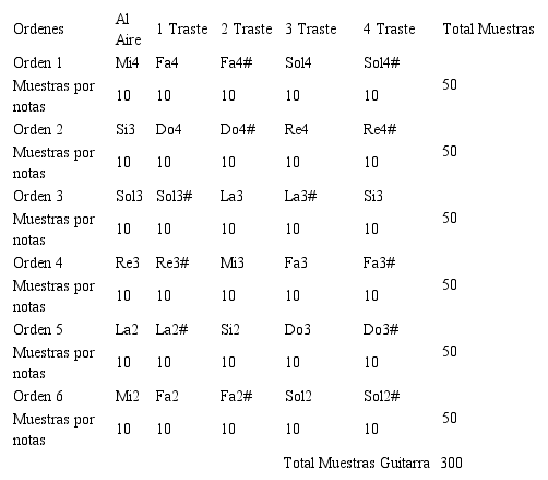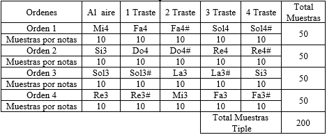 Tabla 2 Número de muestras grabadas de las notas musicales correspondientes a la primera posición de la bandola.