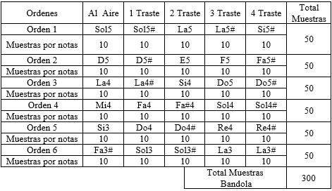 En las Tablas 1, 2, 3 y 4 se presentan las notas musicales grabadas equivalentes a la primera posición de cada instrumentos a identificar (bandola, tiple, tiple requinto y guitarra) y el número de muestras tomadas por cada una de ellas.