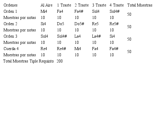 Tabla 4 Número de muestras grabadas de las notas musicales correspondientes a la primera posición del tiple requinto.