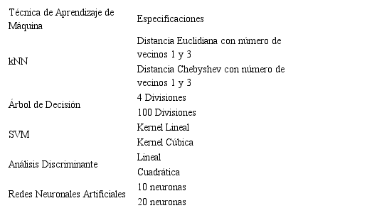 Tabla 5 Especificaciones usadas en los clasificadores.