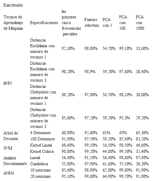 Las Exactitudes alcanzadas por cada una de las cinco técnicas de aprendizaje de máquina, usadas para la identificación de la bandola, tiple, guitarra y tiple requinto se muestran en la Tabla 6, en ella se puede ver que el uso de PCA para la reducción de dimensionalidad genera diferentes resultados de Exactitudes en los clasificadores.