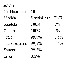 Debido a lo extenso de la investigación, a continuación, solo se presentan los resultados más y menos destacados. En la Tabla 7 se ilustran: lo valores en porcentaje de Exactitud y Error, junto a los porcentajes de la Sensibilidad y la Tasa de Falsos Negativos (FNR) presentada por la bandola, el tiple, el tiple requinto y la guitarra, utilizando la técnica ANNs de 10 neuronas y aplicando a la matriz de entrenamiento el método PCA, eligiendo los primeros 100 componentes principales.