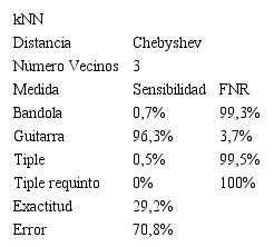 En la Tabla 8 se presentan: los valores en porcentaje de Exactitud y Error, junto a los porcentajes de la Sensibilidad y la Tasa de Falsos Negativos (FNR) presentada por la bandola, el tiple, el tiple requinto y la guitarra en la técnica kNN con distancia Chebyshev y número de vecinos igual a tres; aplicándole a la base de datos de entrenamiento el método de reducción de dimensionalidad PCA y eligiendo 1000 Componentes Principales.