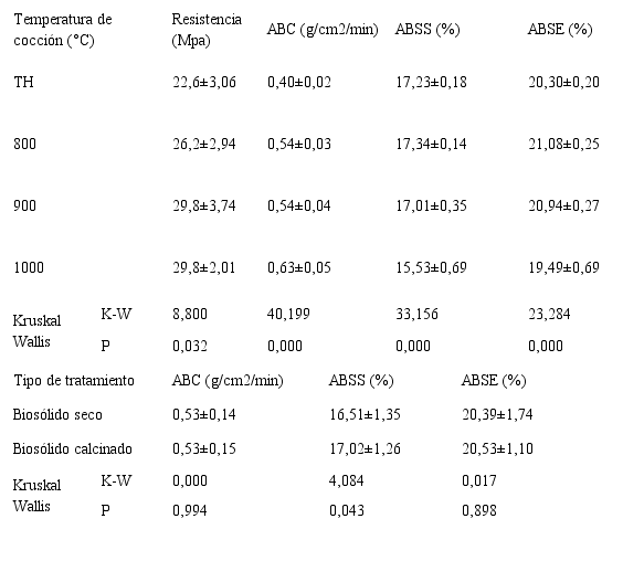 En función del tratamiento del biosólido: La tasa inicial de absorción (ABSC) y el tratamiento del biosólido no presentan diferencias significativas (K-W: 0,000 P>0,994, N: 120); con valores promedios de 0,53 g/cm2/min para biosólido seco, 0,53 g/cm2/min para biosólido calcinado y 0,47 g/cm2/min para patrón, evidenciándose que todos estos incumplen la norma, porque sobrepasan el límite máximo (0,25 g/cm2/min) establecido en la NTC-4205.