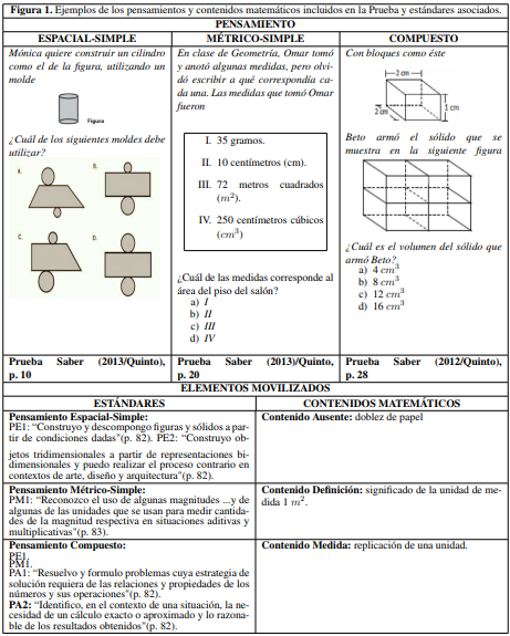 Las Pruebas Saber se aplican periódicamente a estudiantes de educación básica de todo el país. Son de carácter obligatorio y censal (Ley 715 del 2001). Pretenden, caracterizar el desarrollo de las competencias básicas tanto, en lenguaje como en matemáticas y ciencias. A partir del 2002, se evalúa a los estudiantes de grado quinto (calendarios A y B) de todas las instituciones educativas colombianas, desde el 2012 su aplicación es anual. Nuestra atención focalizó en las preguntas que evalúan el desarrollo de pensamiento espacial y métrico.
