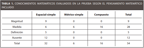 De forma global, los resultados (Tabla 1) evidenciaron una distribución desigual en cuanto al número de preguntas que consideran los pensamientos evaluados. El Espacial-simple, presente en la mitad de las preguntas, fue el más considerado; seguido del compuesto, con una cuarta parte; en cuanto al métrico, apenas una novena parte, le contempló.