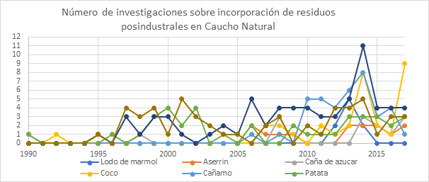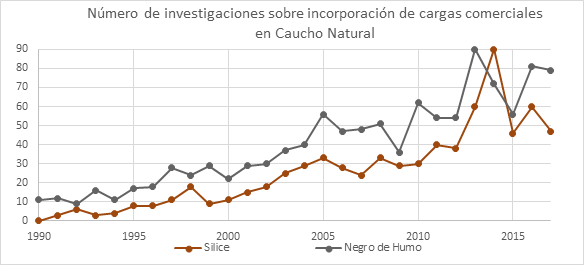 Las figuras 1 y 2 muestran un consolidado del número de investigaciones realizadas en los últimos 27 años para algunas de las cargas alternativas obtenidas a partir de desechos industriales y para las cargas comerciales más utilizadas respectivamente. Se observa que, si bien los desarrollos e investigaciones en caucho natural reforzados con negro de humo y sílice son superiores con respecto a los refuerzos a partir de residuos industriales, se observa un crecimiento en investigaciones con estos últimos.