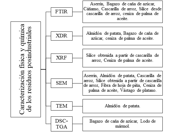 Técnicas de caracterización empleadas para evaluar las propiedades fisicoquímicas de los residuos posindustriales.