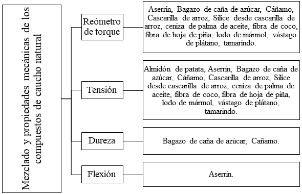 Finalmente, los compuestos de caucho natural reforzados con residuos posindustriales pueden ser evaluados mediante el análisis de sus propiedades mecánicas, como por ejemplo la resistencia a la tensión, al desgarre, a la compresión, dureza y flexión. De acuerdo con el rendimiento mecánico de los compuestos, estos pueden ser empleados en diferentes aplicaciones, obteniéndose con está la posibilidad de fabricar nuevos productos empleando residuos que su disposición final significa una problemática ambiental.