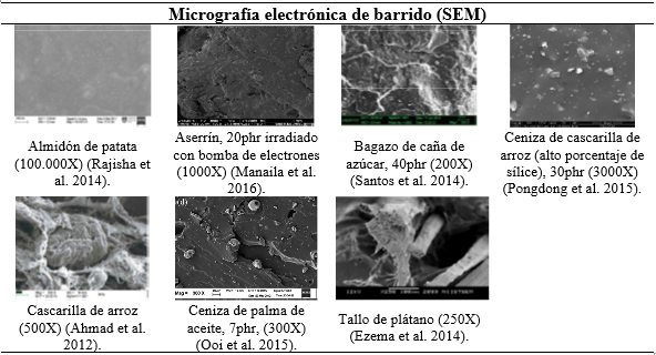 Como fue discutido anteriormente, la morfología de las cargas, la incorporación y la interacción de los diferentes residuos agroindustriales con el caucho natural puede ser evaluado mediante técnicas microscópicas como por ejemplo la microscopia electrónica de barrido (SEM). En la figura 5 se observan diferentes cargas mezcladas con caucho natural, las imágenes escogidas tienen un rango aproximado de aumentos, con el propósito de generar una comparación cualitativa de la interacción de las diferentes cargas con el caucho natural, a excepción de los nano cristales de almidón de patata que debido a su tamaño nanoscópico, los aumentos fueron de 100.000X.