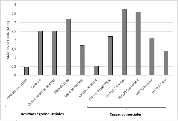 Módulo al 100% de deformación en tensión de algunas cargas agroindustriales y comerciales mezcladas con caucho natural (Vargas et al. 2016; Kaewasakul 2013a).