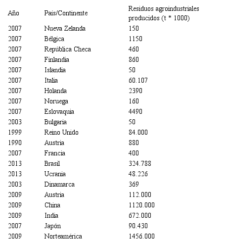1 Datos estadísticos sobre la producción de desechos agroindustriales en diferentes partes del mundo.