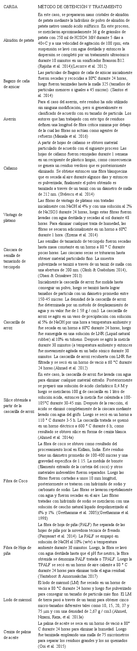 En la tabla 2 se pueden observar los métodos de obtención de algunos de los residuos agroindustriales que se utilizan como carga en el caucho natural y adicionalmente los tratamientos previos a los que son sometidas antes de ser mezcladas e incorporadas en la matriz de caucho natural. Muchos de los tratamientos superficiales o de modificación química que se les hacen a las cargas mejoran notablemente la interacción con la matriz de caucho natural, esta afinidad mejora el rendimiento tecnológico de los compuestos.