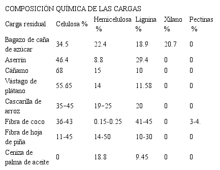 4 Composiciones químicas de otras cargas agroindustriales (Rodolfo Ruiz Posada 2014),(Brumovsky 2014),(Santos et al. 2012)La adición de cargas reforzantes al caucho natural y la interacción de los materiales puede generar o no una mejora en las propiedades fisicoquímicas del material compuesto, ampliando de esta manera el abanico de usos. La adición de las cargas comerciales como el negro de humo por ejemplo, genera una mejora notable en propiedades como la resistencia a la abrasión, al desgarre, a la fatiga, a la fisura por flexión y al desgaste, también mejora el procesamiento, la dureza del material, su elongación y elasticidad; se espera entonces que algunas cargas obtenidas como residuos agroindustriales puedan mejorar algunas de las propiedades que las cargas comerciales logran mejorar (Martínez et al. 2013)(Rattanasom & Prasertsri 2012).
