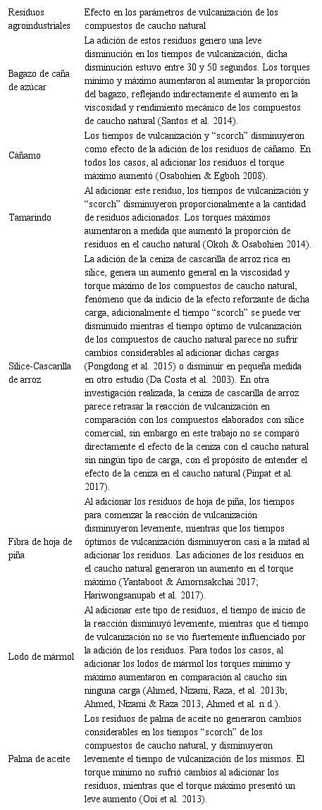 Los residuos agroindustriales pueden generar cambios significativos en el proceso de vulcanización de los compuestos de caucho natural. La naturaleza acida o básica de los residuos genera cambios en los tiempos empleados para la vulcanización del caucho, por ejemplo el tiempo que se demora para comenzar la reacción de vulcanización o tiempo “scorch” (tscorch) puede ser alterado por la incorporación de los residuos, al mismo tiempo que puede ser alterado el tiempo óptimo de vulcanización (t100); el tiempo necesario para alcanzar el 90% (t90) de la vulcanización es un parámetro empleado en el sector cauchero, por lo que es común en algunos trabajos encontrar reportado el t90 en lugar del t100. Los torques máximo (MH) y mínimo (ML) obtenidos mediante la reometría de vulcanización también pueden verse afectados por la incorporación de los residuos posindustriales, esto se debe al aumento en la viscosidad del caucho natural al incorporar los residuos, efecto que se verá reflejado en el aumento del torque mínimo (ML) o un aumento en el torque máximo (MH) como resultado del efecto reforzante de los residuos, representado un primer acercamiento a las propiedades mecánicas de los compuestos.