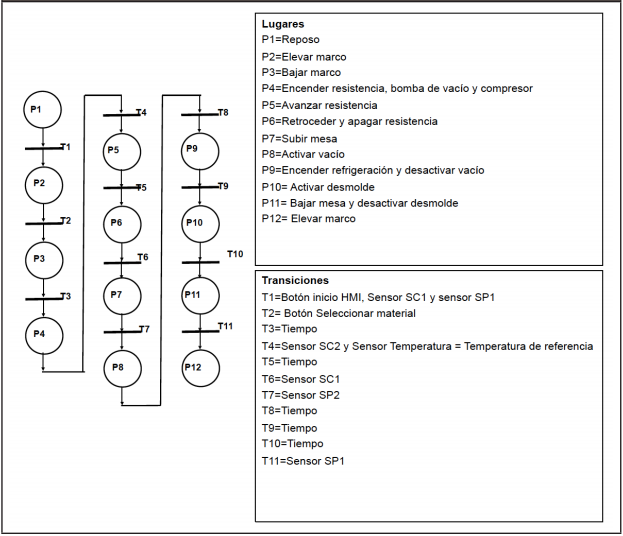 El control de la máquina termoformadora puede realizarse mediante la definición de modo de trabajo automático y modo manual desde la HMI; el primer modo se inicia con la selección del tipo de material a termoformar; dada esta orden, el control ejecuta la secuencia de proceso descrita en la red de Petri (véase figura 10), este modo de operación es recomendado para producción en serie. El modo manual permite manipular cada operación de termoformado de manera independiente, facilitando las tareas de mantenimiento, puesta a punto del proceso y la programación de las variables de temperatura y tiempo de calentamiento en el PLC necesarias para el funcionamiento del modo automático.