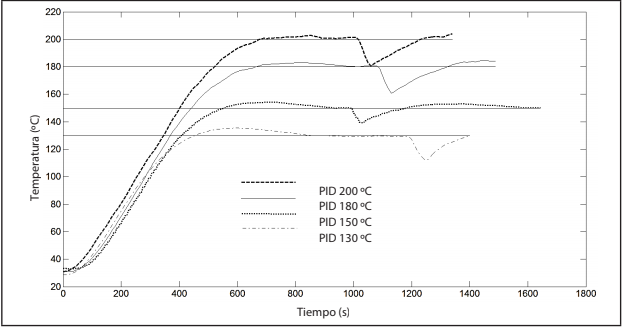 La figura 11 presenta las curvas de temperatura-tiempo del control PID para las referencias de 130, 150, 180 y 200 °C. La figura muestra que la optimización del bloque PID, por medio de la auto sintonía, genera una estrategia de control con sobre impulsos máximos de 3 °C para cada uno los diferentes valores de temperatura de termoformado; además, el tiempo empleado para alcanzar el estado estable es aproximadamente de 15 min (tiempo requerido para iniciar el proceso de termoformado, partiendo de la temperatura ambiente).