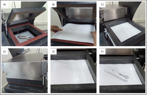 Puesta a punto maquina automatizada de termoformado, a) posicionamiento del molde, b) ubicación de lámina, c) sujeción lamina, d) etapa de calentamiento, e) elevación del molde contra la lámina y f) accionamiento de vacío y motor ventilador.
