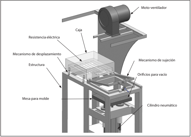 La figura 1 muestra los componentes de la máquina termoformadora por vacío de una sola estación de operación manual, que fue intervenida. Para la reconversión y automatización de la máquina termoformadora, se realizó un diagnóstico que permitió identificar los componentes, capacidades y operación de los sistemas mecánico, térmico, neumático, eléctrico y de control, y su accionar como conjunto. Posteriormente, fueron elaborados los diseños de reconversión de los sistemas; seguidamente se seleccionaron los componentes, se ensamblaron durante la fabricación; finalmente se evaluó el proceso de reconversión y automatización.