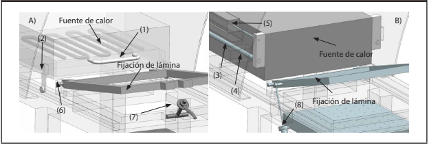 En la figura 2 se presenta el sistema mecánico inicial y el final, destacando los cambios en el posicionamiento de la fuente de calor y la fijación de la lámina polimérica. En el mecanismo de desplazamiento de la resistencia eléctrica (1), los rodachines (2) de la caja fueron reemplazados por guías lineales (par cinemático de cuarta clase) compuestas por dos barras de 1/2 pulgada (3) de acero laminado en frio (calibrado) con tolerancias estrechas, guiadas por rodamientos lineales solidarios a las estructuras (4) y comandadas por un cilindro neumático (5), como es indicado en la figura 2b. El mecanismo de sujeción de la lámina de plástico, inicialmente por rotación (6) y sujeción manual (7) se acondicionó para permitir su rotación y posicionamiento a través de un cilindro neumático (8). Los cambios presentados en la figura 2b favorecen la automatización del sistema y disminución de riesgos de operación, durante el proceso de termoformado.