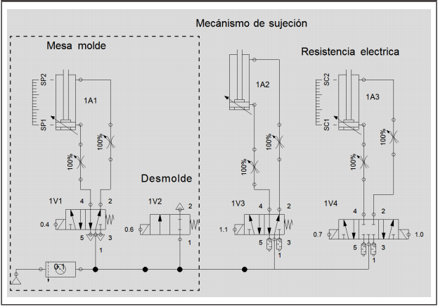 Como se mencionó inicialmente el sistema neumático inicial está formado por un cilindro de doble efecto comandado por dos electroválvulas una 5/2 acoplada al mecanismo de elevación del molde y una 2/2 para el desmolde de la pieza, como se muestra en la región punteado en la figura 3.