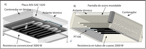 El nuevo sistema está constituido por espiras de alambres tipo níquel-cromo de 4,21 Ω/m cuya longitud genera una potencia de 2000 W a 220 VCA, al interior de siete tubos de cuarzo (øint = 9 mm y øext =12 mm), con capacidad de irradiar cerca del 95 % de energía infrarroja en el rango 1,1 a 2,9 micrones, y con terminales cerámicos. Todo el sistema fue ensamblado sobre una estructura perforada, fabricada en acero inoxidable de 1 mm de espesor y protegida por un contenedor en acero inoxidable AISI 304 de 2 mm de espesor, ambas piezas separadas en la parte superior por un aislante térmico y una lámina de acabado tipo espejo. El censado de temperatura puede ser realizado por medio de una termo-resistencia PT100. La figura 4 presenta el sistema térmico antes y después del rediseño.