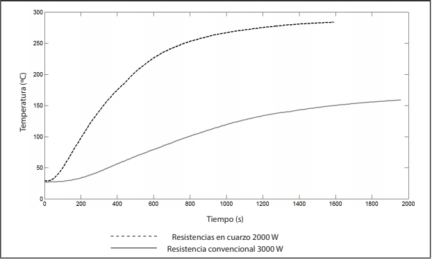 La figura 5 presenta las curvas de temperatura-tiempo para el sistema térmico antes y después. La figura muestra como el nuevo sistema alcanza temperaturas cercanas al doble de la temperatura del sistema inicial. Este aumento de temperatura ofrece la ventaja de procesar materiales con temperaturas de transición vítrea superiores como son el SAN (estireno acrilonitrilo), el Policarbonato, el Poliestireno de alto impacto, el Acrilico cell-cast, entre otros. Adicionalmente, para el termoformado de materiales entre 130 y 150 °C el sistema diseñado presenta una tasa de calentamiento de hasta ocho veces la del sistema previo y con menor consumo de potencia.