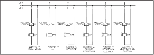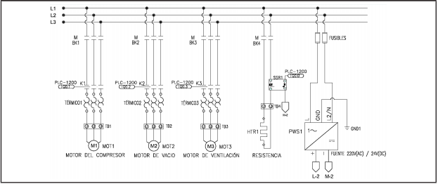 El diseño del sistema eléctrico (figura 6 y 7) contiene un circuito de potencia trifásico a 220 VCA (véase figura 6) para suministrar energía: al motor Siemens del compresor (0,67 kW, 1685 min-1, 3,1 A – 3,55 A); al motor de la bomba de vacío Edwards E2M5 (0,7 kW, 1750 min-1, 3,2 A); al motor del ventilador (0,18 kW, 280 min-1, 0,8 A); al presostato (0 bar - 6 bar); a las lámparas de cuarzo (2 kW); a las electroválvulas (vías neumáticas y de presión) y la fuente de alimentación ( entrada 220 VCA y salida de 24 VCD) para el PLC (Siemens 1200 + HMI y módulo SM 1231 RTD), y los sensores magnéticos (posición de los cilindros neumáticos) y de temperatura (PT100).