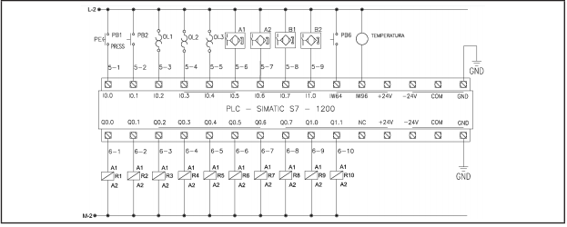 El otro circuito diseñado es el de entradas y salidas del PLC (véase figura 8), en el cual las entradas corresponden a: las señales de los relés térmicos (motores), los sensores magnéticos (cilindros neumáticos), sensores de presión (compresor y bomba de vacío), sensor de temperatura (PT100) y paro de emergencia.
