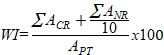(1)El índice de muro es la relación entre el área transversal efectiva de muro en la dirección más débil en la base del edificio y el área total de piso por encima de la base de la estructura. El índice de columna es la relación del área transversal efectiva de columna en la base de la estructura con respecto al área de piso total por encima de la base. Se consideran áreas efectivas el 100% del área de muros de concreto reforzado, el 10% del área de muros no reforzados y el 50% del área de columnas; estos porcentajes representan el aporte de resistencia y rigidez de cada elemento estructural. Las ecuaciones 2 y 3 corresponden a los índices de muro y de columna, donde ∑AC es el área total de sección transversal de columnas en el nivel inferior, ∑ACR representa el área total de sección transversal de muros de concreto reforzado en el nivel inferior en la dirección más débil, ∑ANR representa el área total de sección transversal de muros de mampostería no reforzada en el nivel inferior en la dirección más débil y ∑APT es el área total de piso por encima de la base del edificio.