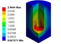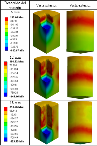 Como se puede observar en el análisis realizado en la figura 9, el valor del esfuerzo normal al igual que el esfuerzo equivalente de Von Mises presentados en la figura 8, mantiene un valor constante en la zona de compresión del punzón sobre el tocho. Cabe destacar en la figura 9 que la zona de mayor esfuerzo a compresión es la zona azul, esta se mantiene a medida que el punzón penetra; además, se puede observar un comportamiento de esfuerzo a tracción del material que se está extruyendo hacia arriba donde el mayor esfuerzo se presenta en los contactos de las paredes laterales del punzón y la pared del contenedor (zona roja).