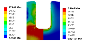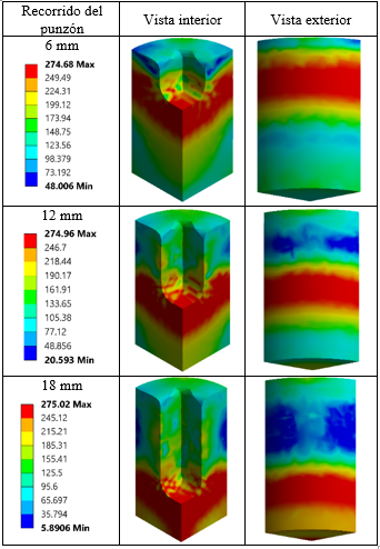 En la figura 8 se observa el comportamiento del material extruido presentando un esfuerzo máximo en la capa que está en contacto con la cara normal al desplazamiento del punzón. Este comportamiento se aprecia a lo largo del recorrido realizado por el punzón, además de ser un valor aproximadamente constante, en este caso alrededor de 275 MPa.