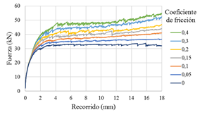 En la figura 12 se logra observar el comportamiento de la fuerza de extrusión en el punzón vs desplazamiento punzón, donde la carga de formación aumenta de manera brusca al inicio del recorrido del punzón y luego crece de manera gradual hasta el final del proceso, evidenciando que este es el comportamiento típico mostrado por diferentes autores (P.Groover, 2007; (Plancak et al., 2012; García-Domínguez et al., 2015; Dieter and Bacon, 1988); también se aprecia la influencia de la fricción en la extrusión indirecta, a medida que incrementa el coeficiente de fricción se requiere mayor fuerza para realizar el recorrido.