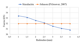 La figura 13 muestra el comportamiento de la fuerza máxima de extrusión conforme, se varía el radio de redondeo del punzón, donde se observa que a medida que el punzón tiene un redondeo mayor, la fuerza de extrusión disminuye. Por otro lado, los cálculos de la fuerza teórica a partir de la fórmula de Johnson (P.Groover, 2007) presentan una variación entre el 0 % y el 5% comparado con los diferentes valores de redondeo sin involucrar la fricción
