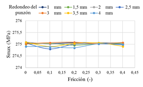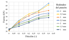 Fuerza máxima vs coeficiente de fricción de acuerdo con el redondeo del punzón