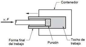 La extrusión es un proceso de formado por compresión en el cual el metal de trabajo es forzado a fluir a través de la abertura de un troquel para darle forma a su sección transversal (P.Groover, 2007). En la extrusión indirecta, también llamada extrusión hacia atrás y extrusión inversa, ver Figura 1, al penetrar el punzón en la pieza de trabajo, fuerza al metal a fluir a través del claro en una dirección opuesta a la del punzón (P.Groover, 2007).