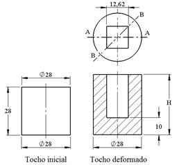 El modelo para la extrusión indirecta consta de una pieza cilíndrica como material de trabajo (tocho) de 28 mm de diámetro y 28 mm de altura, como se plantea en la Figura 2, donde el lado izquierdo muestra el tocho sin deformar y a la derecha se encuentra el tocho deformado después del proceso de extrusión inversa. El punzón es de sección transversal cuadrada de 12,62 mm x 12,62 mm y se considera como cuerpo rígido, al igual que el contenedor, despreciando así cualquier deformación o esfuerzo que estos cuerpos puedan presentar. Las dimensiones de los elementos son basadas en los estudios realizados por (Plancak et al., 2012; Plancak, 2012).