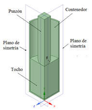 En la figura 3 se puede ver el modelo en 3D y los planos de simetría utilizados en las simulaciones, donde R es el redondeo del punzón a analizar, el cual tomará diferentes valores en los modelos. El comportamiento simétrico analizado en los modelos reduce el tiempo computacional de procesamiento para la solución de cada simulación.